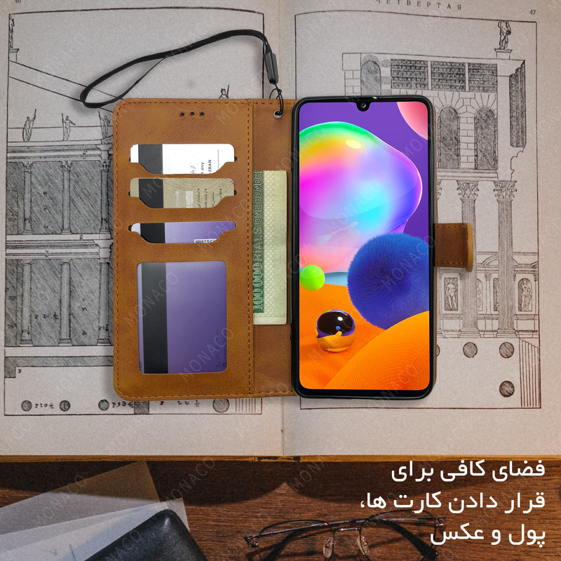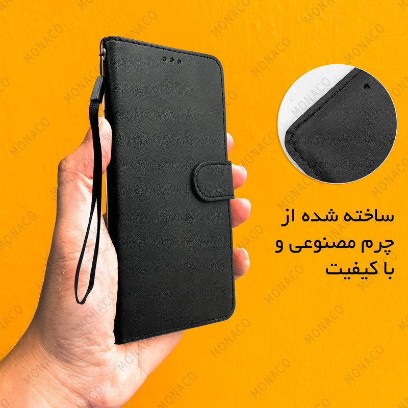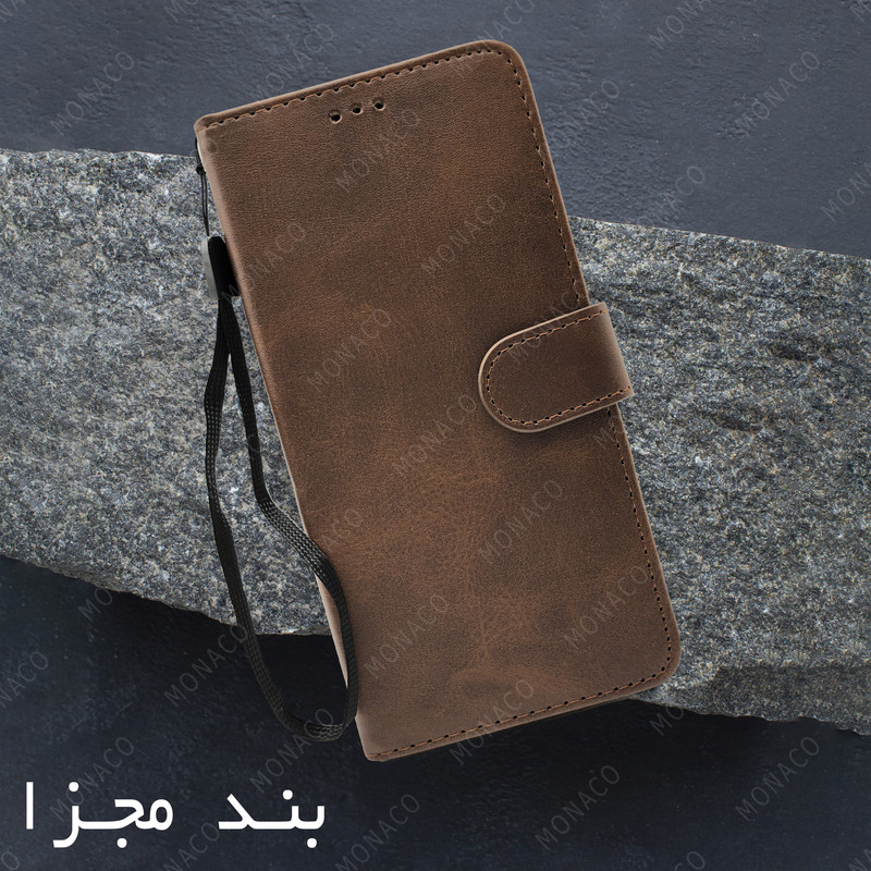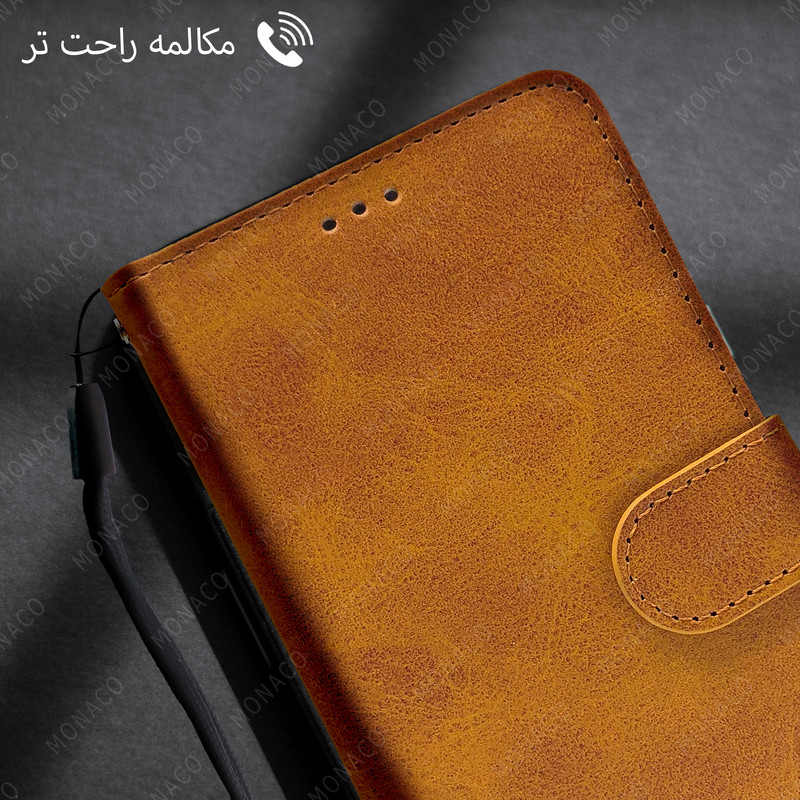 کیف چرمی موناکو از چرم و TPU باکیفیت ساخته شده است که می توانید برای نگهداری ایمن و زیبای گوشی خود از آن استفاده نمایید. اولین نکته که هنگام باز کردن درب کیف متوجه آن می شویم، وجود بندی با دکمه ی آهن ربایی است که به محکم بسته شدن آن کمک می کند و از محتویات داخل کیف به بهترین شکل مراقبت میکند. این طراحی مدرن در قالبی از جنس و مواد با کیفیت به شما کمک می کند تا تمام لوازم ضروری خود مانند گوشی، پول نقد و کارت های اعتباری خود را در کیف چرمی بسیار خوش دست و زیبا در اختیار داشته باشید. دورتادور این قاب منعطف بوده و گوشی به راحتی داخل قابی که روی کیف وجود دارد قرار میگرد. این قاب به طور کامل بدنه ی گوشی را می پوشاند البته محل پورتها و دوربین به دقت برش خورده است و حتی برای شارژ نیازی به بیرون آوردن گوشی از کاور وجود ندارد. همچنین در قسمت کناری کیف، بند مچی ای تعبیه شده باعث جلوگیری از سقوط ناگهانی گوشی و یا سرقت آن می شود. یکی دیگر از امکانات این کیف قابلیت استند شدن آن است که میتوانید در این صورت توسط کیف، گوشی را روی سطح صاف مانند میز قرار داده وبه تماشای موزیک ویدئو یا فیلم بپردازید.