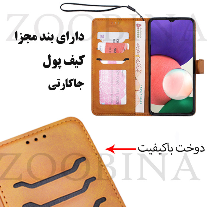 کیف چرمی زوبینا از چرم و TPU باکیفیت ساخته شده است که می توانید برای نگهداری ایمن و زیبای گوشی خود از آن استفاده نمایید. اولین نکته که هنگام باز کردن درب کیف متوجه آن می شویم، وجود بندی با دکمه ی آهن ربایی است که به محکم بسته شدن آن کمک می کند و از محتویات داخل کیف به بهترین شکل مراقبت میکند. این طراحی مدرن در قالبی از جنس و مواد با کیفیت به شما کمک می کند تا تمام لوازم ضروری خود مانند گوشی، پول نقد و کارت های اعتباری خود را در کیف چرمی بسیار خوش دست و زیبا در اختیار داشته باشید. دورتادور این قاب منعطف بوده و گوشی به راحتی داخل قابی که روی کیف وجود دارد قرار میگرد. این قاب به طور کامل بدنه ی گوشی را می پوشاند البته محل پورتها و دوربین به دقت برش خورده است و حتی برای شارژ نیازی به بیرون آوردن گوشی از کاور وجود ندارد. همچنین در قسمت کناری کیف، بند مچی ای تعبیه شده باعث جلوگیری از سقوط ناگهانی گوشی و یا سرقت آن می شود. یکی دیگر از امکانات این کیف قابلیت استند شدن آن است که میتوانید در این صورت توسط کیف، گوشی را روی سطح صاف مانند میز قرار داده وبه تماشای موزیک ویدئو یا فیلم بپردازید.