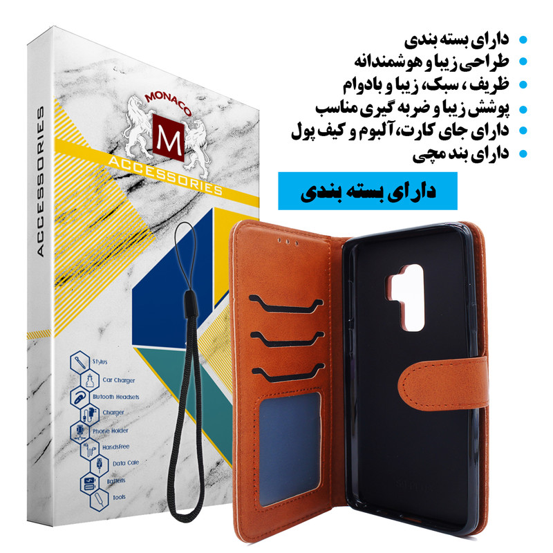 کیف چرمی کلاسوری موناکو، کاوری شیک و زیبا برای گوشی سامسونگ Galaxy S9 Plus است که از چرم مرغوب و باکیفیتی ساخته شده است. این کاور با پوشش کامل پشت، نمایشگر و دور تا دور گوشی به خوبی از آن در برابر آسیب هایی مانند خراشیدگی، ضربات احتمالی، شوک و گرد و غبار محافظت می کند.گوشی شما به راحتی درون این کیف قرار می گیرد و نیاز به دقت خاصی برای نصب آن روی گوشی وجود ندارد. قاب داخلی کیف، جنسی نرم و منعطف دارد که باعث می شود تا گوشی به راحتی درون آن قرار بگیرد. این قاب تمام بدنه گوشی، اعم از گوشه ها و لبه های رویی نمایشگر و دورتادور آن رامی پوشاند. در نهایت لایه چرمی یکدستی پشت قاب و روی نمایشگر را پوشش می دهد.ارتفاع میان قاب و لنز دوربین پشت گوشی باعث می شود تا هنگامی که گوشی را روی میز یا سطوح صاف قرار می دهید، لنز آن دچار خراشیدگی نشود.محل پورت ها و دوربین به دقت روی کاور برش خورده اند و محدودیتی هنگام شارژ یا اتصال کابل هندزفری نخواهید داشت. روی دکمه ها نیز توسط قاب ژله ای داخلی پوشانده شده است که این ویژگی باعث عدم آلودگی آن ها می شود. البته لمس دکمه ها، پاسخگویی خوبی دارد.داخل درب کیف ، یک جیب وجود دارد که برای نگهداری کارت اعتباری به کار می رود. در صورت دلخواه می توانید با استفاده از درب کیف، گوشی را به گونه ای روی میز قرار دهید که بتوانید به راحتی به تماشای فیلم و یا موزیک ویدئو بپردازید.